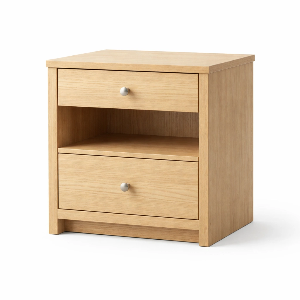 Dieser Nachttisch besteht aus stabilem Holzwerkstoff in einer Eiche-Optik. Er verfügt über zwei Schubladen mit Griffen aus Metall. Die Maße des Nachttischs sind 40 cm in der Länge, 30 cm in der Breite und 50 cm in der Höhe. Das Gewicht beträgt 10 kg.